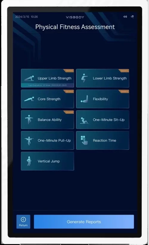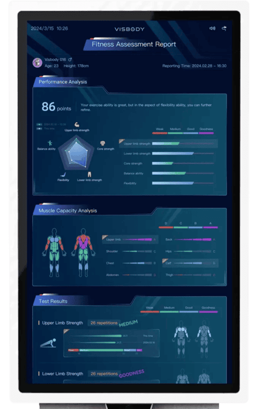 Fournit une analyse approfondie avec 12 analyses de composition corporelle, 10 évaluations de la posture et 14 évaluations de la condition physique.